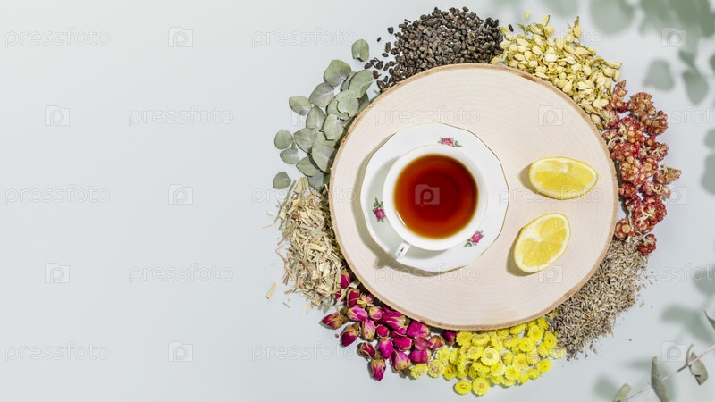 Сухие дикорастущие цветы, травы, чашка чая и ломтики лимона на синем фоне