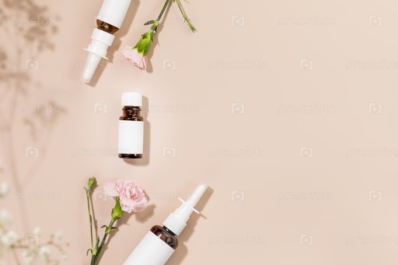 Натуральные капли для носа, увлажняющий спрей и масло для лечения простуды и ухода за носовой полостью. Бутылочки с лекарствами с натуральными средствами на розовом фоне с цветами. Макет, плоская планировка, пространство для копирования