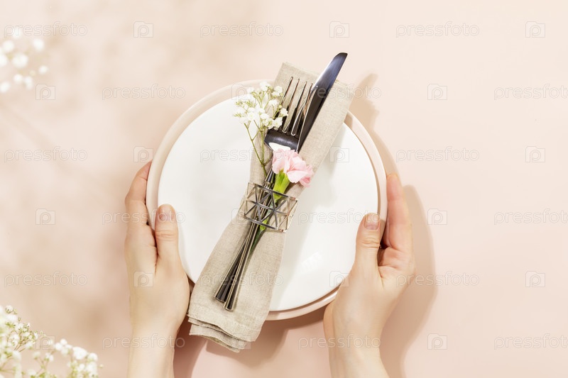 Женские руки держат праздничные блюда на светло-розовом фоне с весенними белыми цветами и тенями. Романтическая сервировка праздничного стола. Плоская планировка