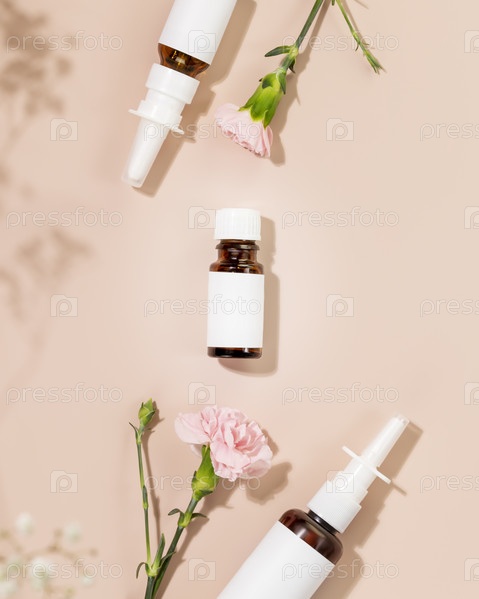 Натуральные капли для носа, увлажняющий спрей и масло для лечения простуды и ухода за носовой полостью. Бутылочки с лекарствами с натуральными средствами на розовом фоне с цветами. Мокап, плоская планировка, вертикальный формат