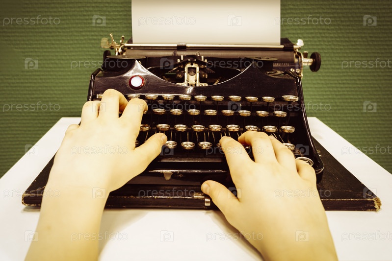 Руки анонимного молодого человека печатают на старинной пишущей машинке, заполненной белым чистым листом бумаги на белом столе у зеленой стены. Концепция истории работы журналиста, творчества, вдохновения