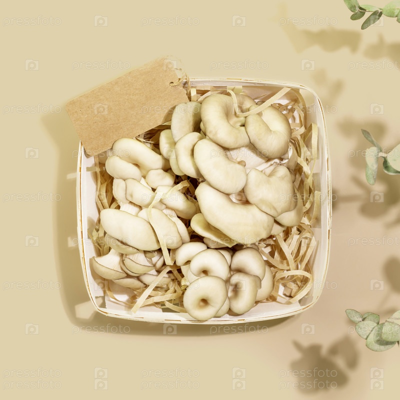 Съедобные грибы. Крупным планом органические вешенки в деревянной коробке с пустой этикеткой на бежевом фоне с листьями. Натуральные продукты и здоровая веганская или вегетарианская пища. Плоская планировка