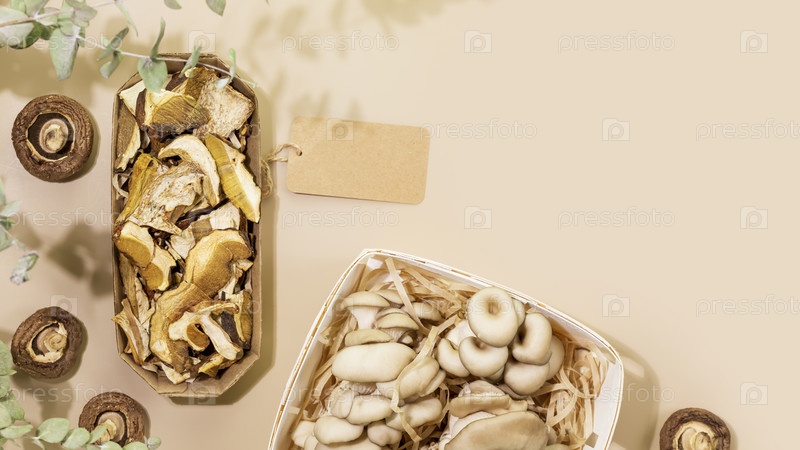 Сухие и натуральные грибы в экоупаковках с пустой этикеткой на бежевом фоне