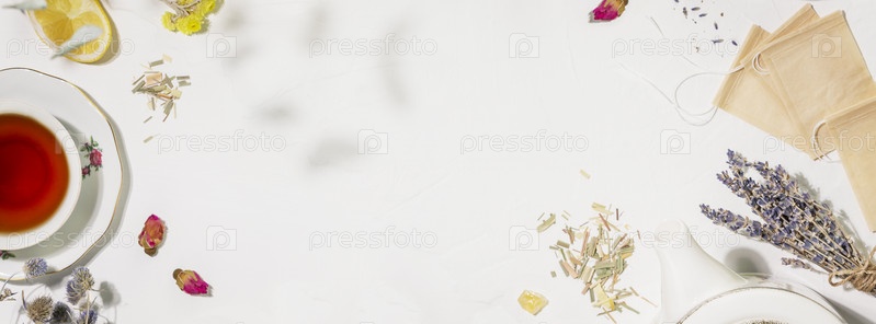 Целебный травяной чайный баннер с дикими растениями и цветами. Концепция домашнего травяного аптекаря. Устойчивая плоская планировка с живыми цветами и травами, бумажными чайными пакетиками, чашкой чая на белом фоне. Копировать пространство