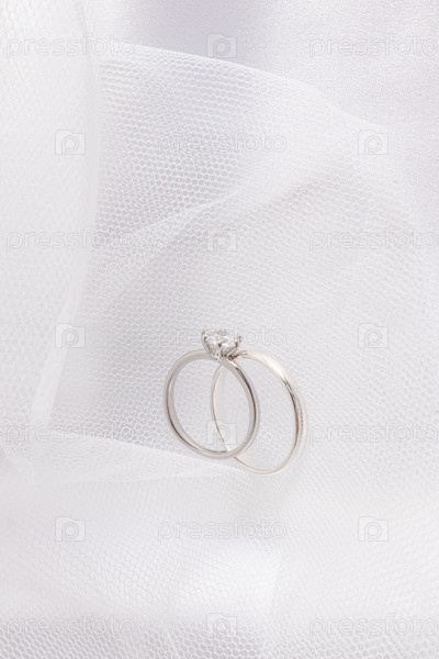 Пара обручальных колец из белого золота с бриллиантом на белой фате невесты и жемчужными бусинами. Макет для пригласительного, обложки