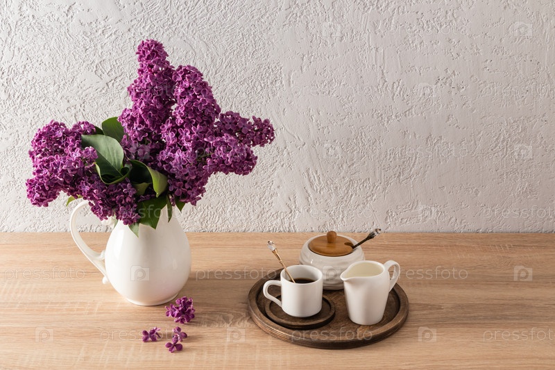 Весенний натюрморт. Кувшин с букетом сирени и деревянный круглый поднос с чашкой утреннего кофе, сахарница на деревянной столешнице