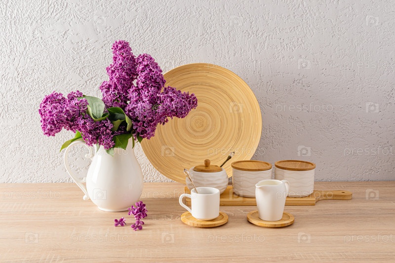 Набор белых керамических баночек для сыпучих продуктов и чашка утреннего кофе на кухонной столешнице с букетом сирен в белом кувшине
