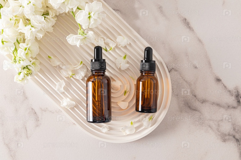 Коричневые янтарные бутылки с антивозрастным средством по уходу за кожей лица на белом гипсовом подносе с белыми цветами. омолаживающий эффект