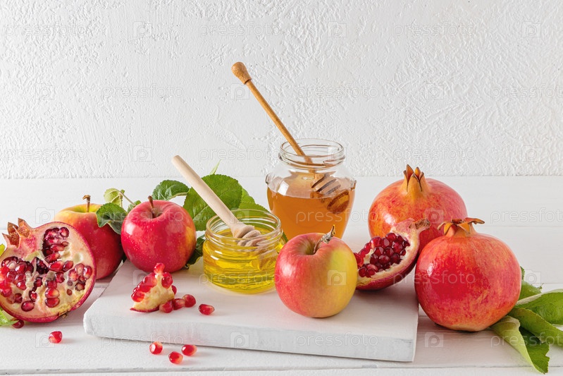 Концепция еврейского новогоднего праздника Рош ха-Шана. Традиционный символ. Яблоки, мед, гранат