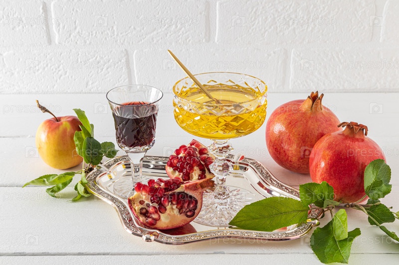 Миска меда, стакан красного вина, спелые гранаты и яблоки на серебряном подносе у стены из белого кирпича. Концепция Рош ха-Шана