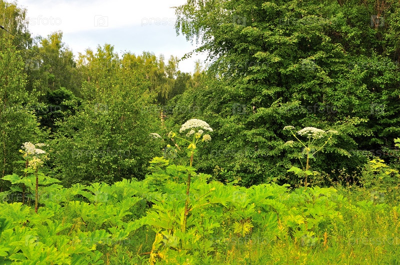 Борщевик около леса на фоне леса