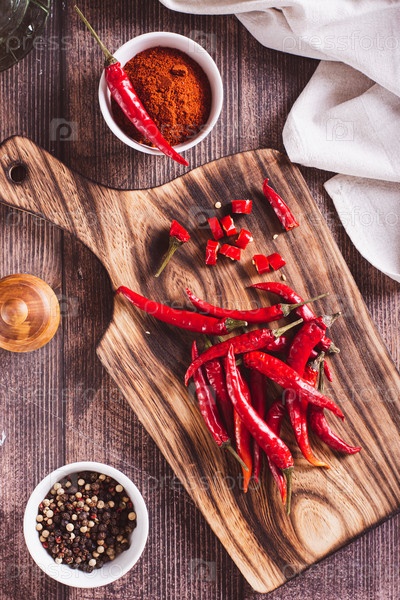 Измельченный красный острый перец и целые перцы на деревянной доске сверху и вертикальный вид
