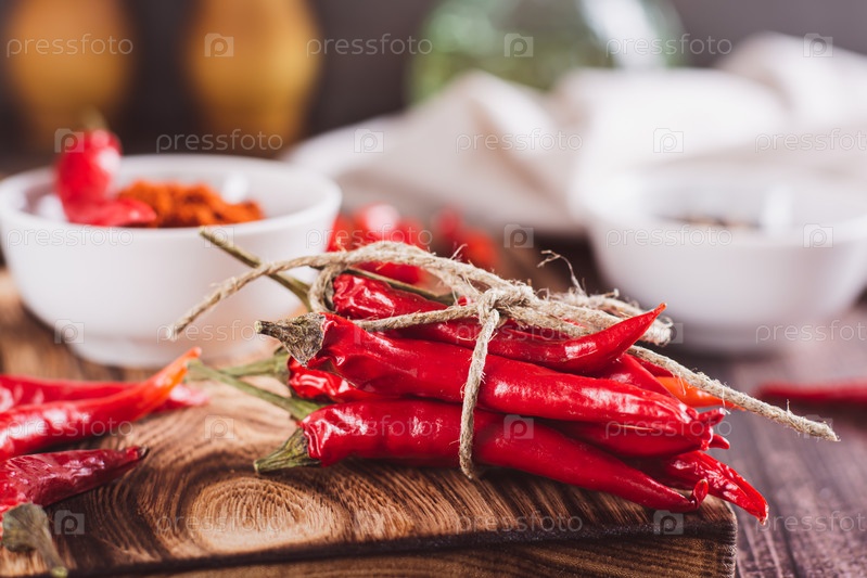 Куча красных острых сырых перцев, привязанных веревкой на деревянной доске крупным планом