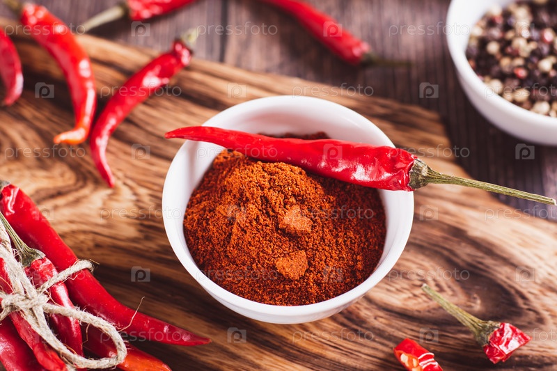 Красный сырой острый перец в миске с паприкой на деревянном фоне крупным планом