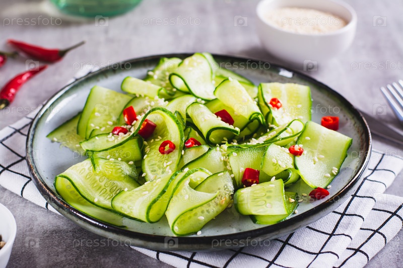 Острый салат из ломтиков огурца, острого красного перца и кунжута на тарелке