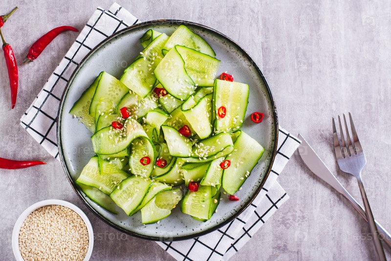 Острый салат из ломтиков огурца, острого красного перца и семян кунжута на тарелке сверху