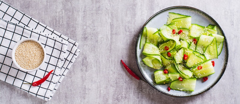 Свежий салат из огурцов, острого красного перца и семян кунжута на тарелке, вид сверху, веб-баннер