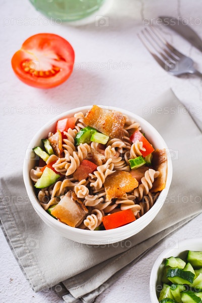 Свежий салат из гречневой пасты, помидоров, огурцов и жареного бекона в миске по вертикали