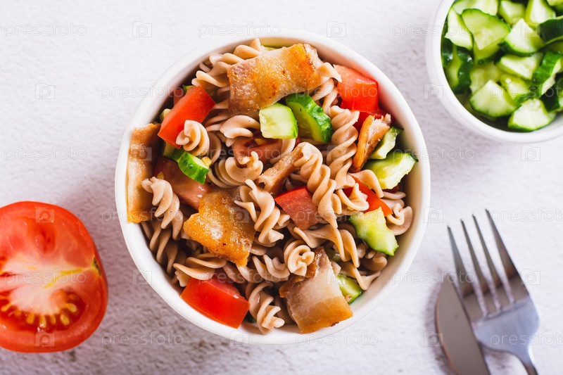 Крупный план сытного салата из макарон, помидоров черри, огурцов и жареного бекона в миске сверху