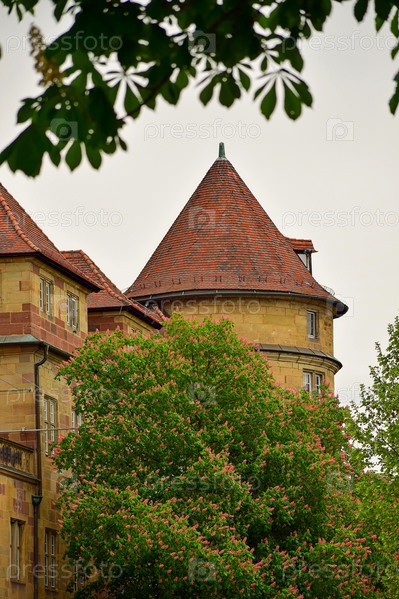 Башня старого здания с крышей, покрытой черепицей