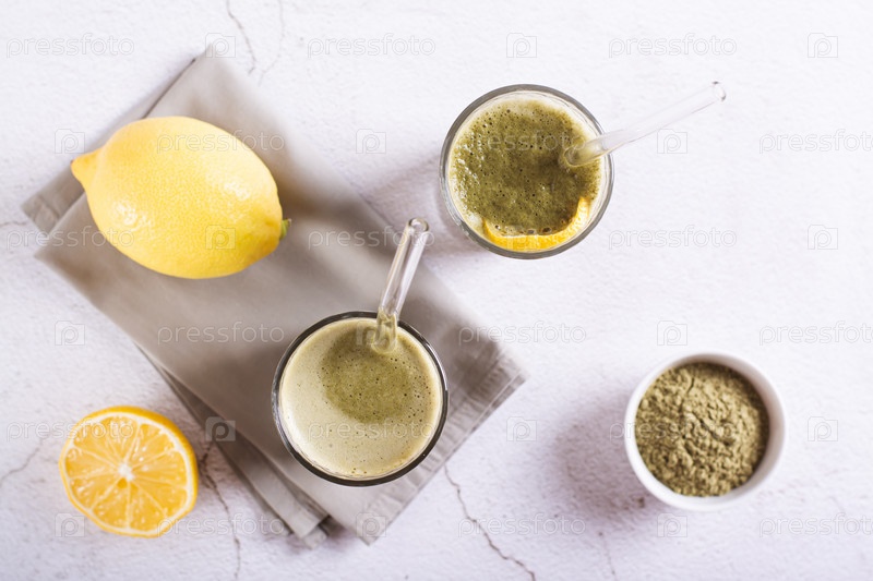 Освежающий чай маття с лимоном в стаканах с соломинкой на столе