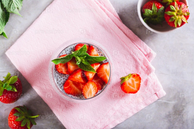 Пудинг из семян чиа с кусочками свежей клубники и мятой в стакане на столешнице