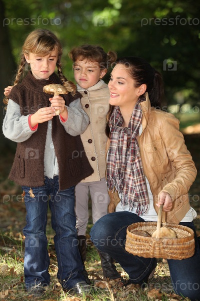 Мать и дочери собирают грибы