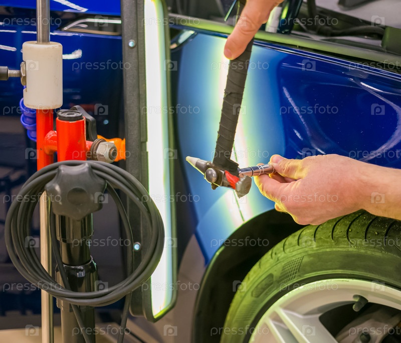 Удаление пятен без покраски. Технология PDR для ремонта кузова автомобиля. ПДР. Механик в автомастерской с инструментами для ремонта пятен на кузове автомобиля. Ремонт кузова