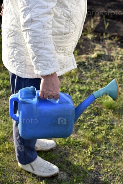 Полив растений в саду лейкой с водой. Поливает растения пенсионерка в саду