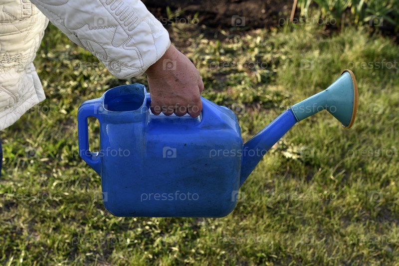 Полив растений в саду лейкой с водой. Поливает растения пенсионерка в саду