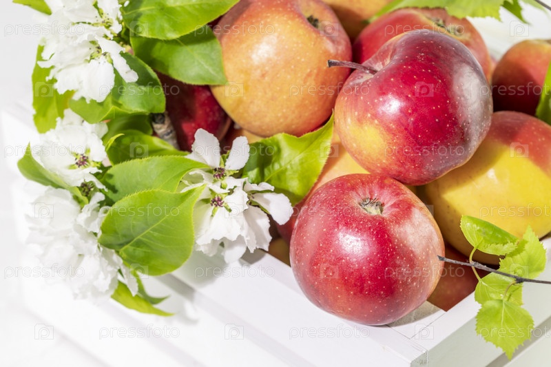 Закройте натуральные красные яблоки с цветущей веткой в деревянной коробке