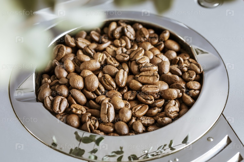 Натуральные жареные кофейные зерна в бункере для зерен, часть кофеварки. Приготовление кофе. Стиль мягкого фокуса, естественный свет. Крупным планом