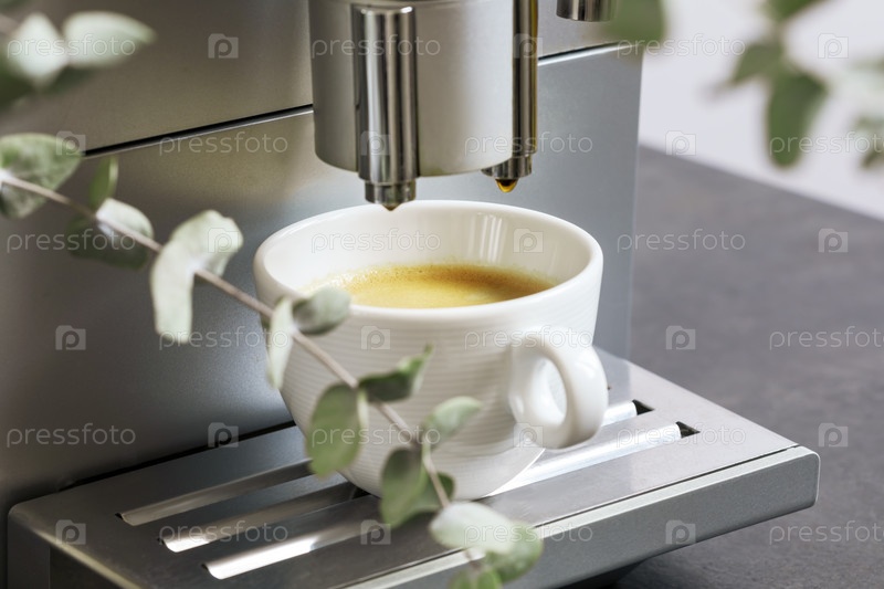 Чашка натурального эспрессо на кофемашине с ветвями эвкалипта