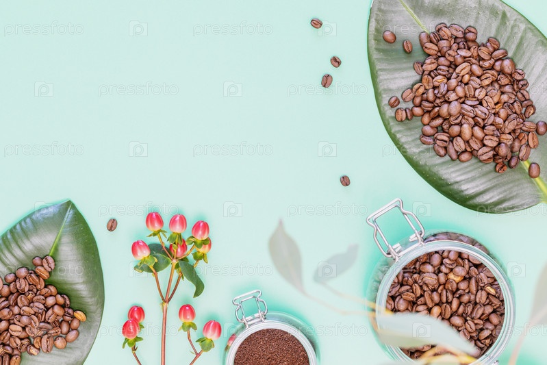 Кофейные зерна и молотый кофе на тропических листьях и в стеклянных банках с цветами