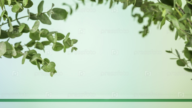 Пустая стеклянная полка на голубом фоне с ветвями эвкалипта