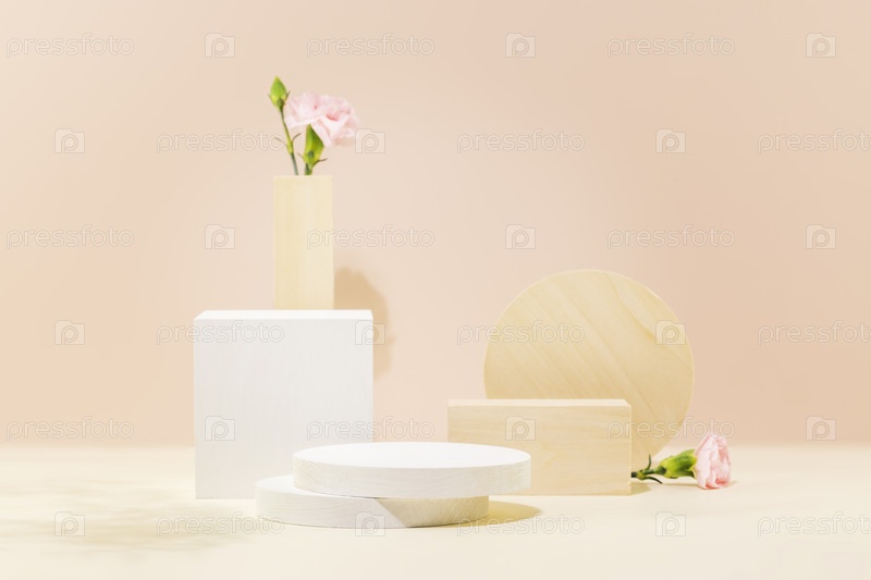 Пустые подиумы с нежными цветами и геометрическими фигурами на пастельно-розовом фоне