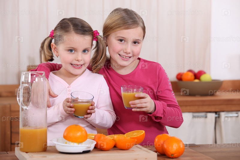 Две сестры пьет апельсиновый сок