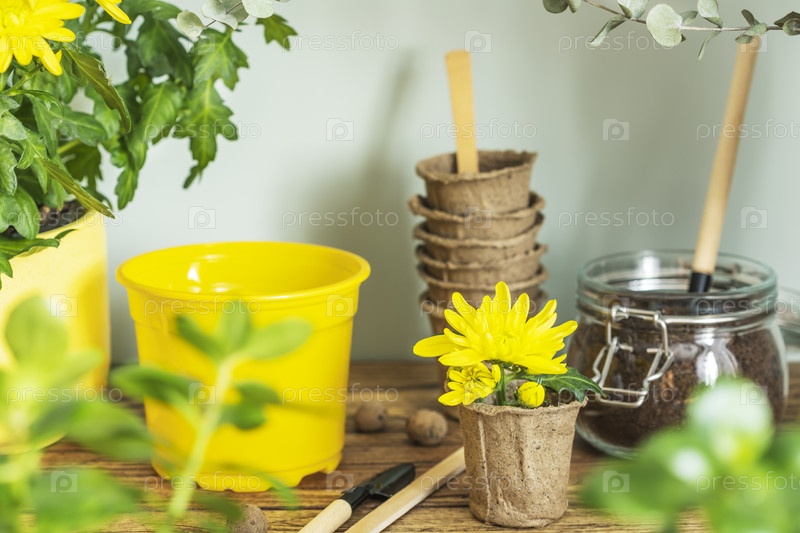 Озеленение квартиры. Желтый садовый горшок, растения в горшках и садовые аксессуары на деревянном столе на синем фоне. Хобби выращивание домашних растений