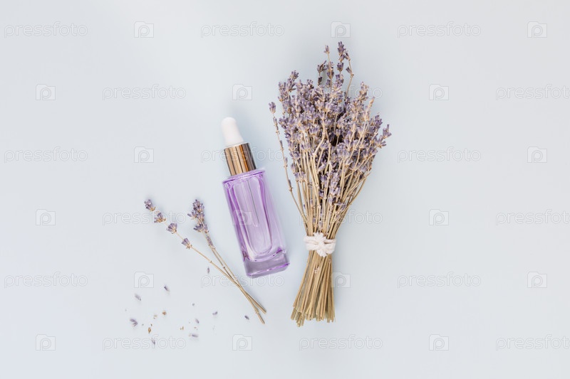 Бутылка-капельница с натуральной лавандовой сывороткой или косметическим маслом и цветами лаванды