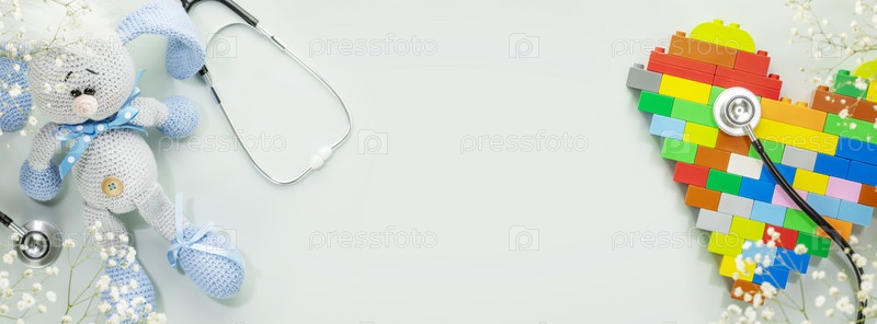 Детский баннер здравоохранения с игрушечным кроликом и сердцем-конструктором со стетоскопом