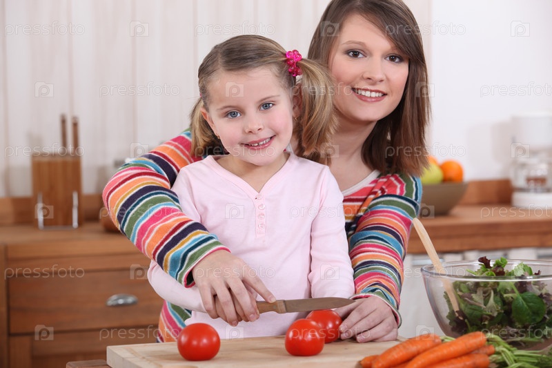 Мать и дочь режут помидоры
