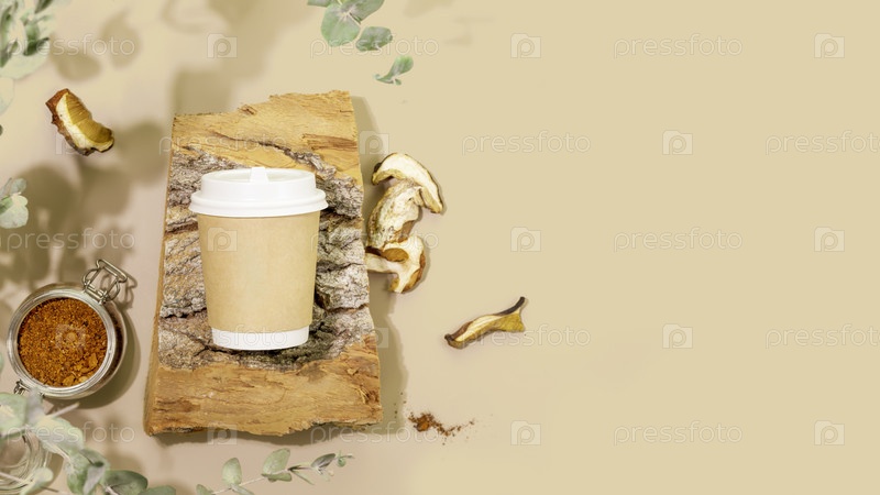Грибной кофе с собой. Одноразовая чашка свежего грибного кофе, сухих грибов и порошка на бежевом фоне с листьями. Здоровая веганская или вегетарианская пища. Новый тренд суперфудов. Скопируйте пространство, вид сверху