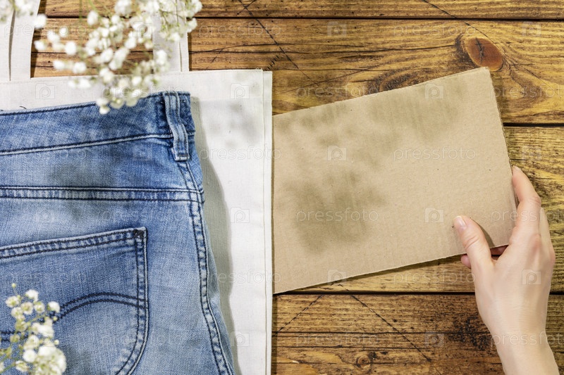 Устойчивый натюрморт с джинсами на текстильной сумке и женской рукой, держащей пустой картон для вашего текста. Магазин секонд-хенд. Циркулярная мода, экологически чистые покупки, концепция бережливого магазина. Копировать пространство