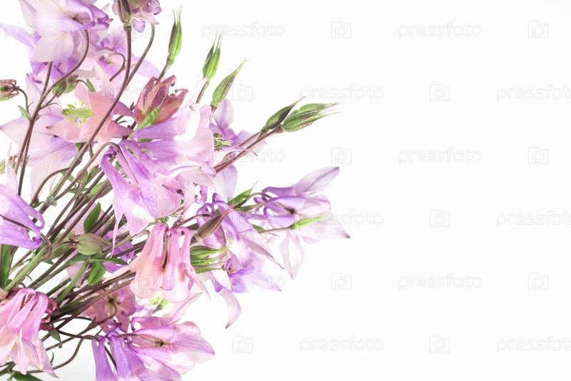Цветочный нежный фон для текста или продукта, вид сверху Букет розовых полевых цветов Aquilegia на белом фоне с жёсткими тенями Граница