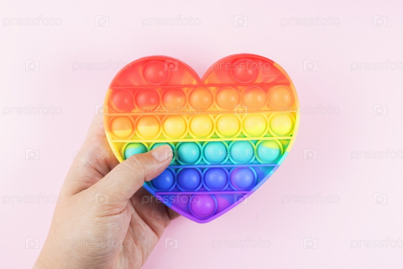 Красочная антистресс-игрушка Pop it. Радужная сенсорная непоседа изолирована на розовом фоне, в руке во время игры. Новая модная силиконовая игрушка. Игрушка для развития мелкой двигательной способности пальцев руки