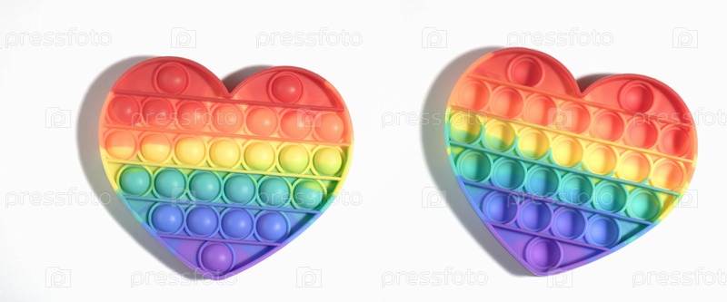 Красочная антистресс-игрушка Pop it. Радужная сенсорная непоседа изолирована на белом фоне с жёсткими тенями. Новая модная силиконовая игрушка. Игрушка для развития мелкой двигательной способности пальцев рук. Вид сверху