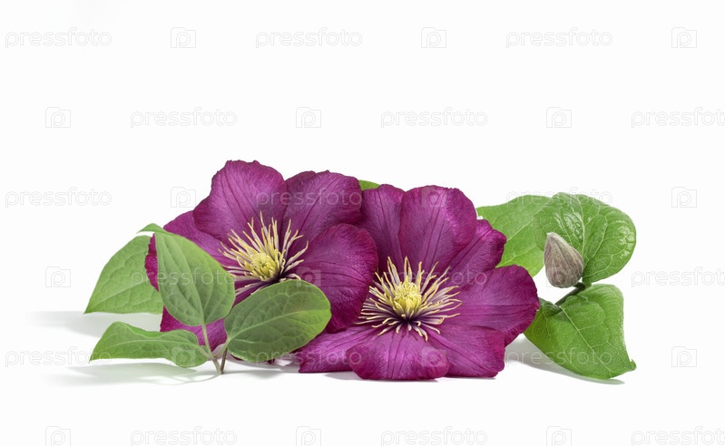 Розовые фиолетовые цветы клематиса, изолированные на белом фоне. Цветочный летний или весенний фон. Открытка