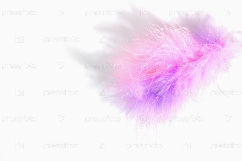 Розовое сиреневое перо пуха изолировано на белом фоне крупным планом. Пушистый розовый пух