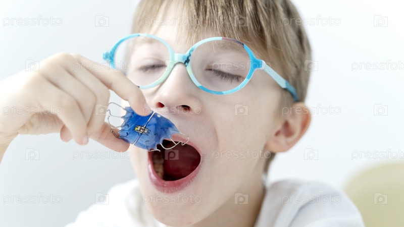 Зубная пластина. Расширение челюсти у ребенка. Тарелка в небо. Не хватает места для моляров. Счастливая девушка держит в руках ортодонтическую пластину