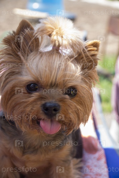 Йоркширский терьер сидит в тенечке